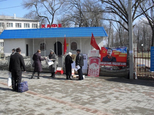 13 марта с.г. активисты ВКПБ Северского района, в станице Северской около входа в парк им. Пушкина провели пикет. Целью пикета было выражение общественного мнения участников публичного мероприятия по социальным и политическим вопросам, одним из которых был – результаты политики горбачёвской перестройки. На пикете, кроме наших символов, присутствовал агитационно-политический стенд, с призывом к жителям района подниматься на борьбу за свои социальные, экономические и политические права, с требованиями к Федеральной, Региональной и Муниципальной власти: прекратить повышение цен на газ, электроэнергию, землю и др. Снизить цены на лекарство, на продукты и товары первой необходимости. На пикете распространялись газеты «Рабоче-крестьянский Серп и Молот», «Рабоче-крестьянская правда», молодёжная газета ВМГБ «Революция» и разъяснительные листки, приуроченные к политическому событию дня и цели пикета. Во время провидения нами 2-х часового санкционированного мероприятия, мы услышали следующее общественное мнение от людей: Хорошо, что Вы есть. Мы помним и знаем Нину Александровну Андрееву. И правильно делаете, что организовываете такие мероприятия. Надо чаше их организовывать и больше работать с людьми. Да, надо подниматься на акции протеста. Организовывайте и мы Вас будем поддерживать. Нам уже терять нечего. Миллиардеры множатся и богатеют, а мы голодаем и вымираем. Это не власть, а бандиты. Их всех надо к стенке и многое другое.