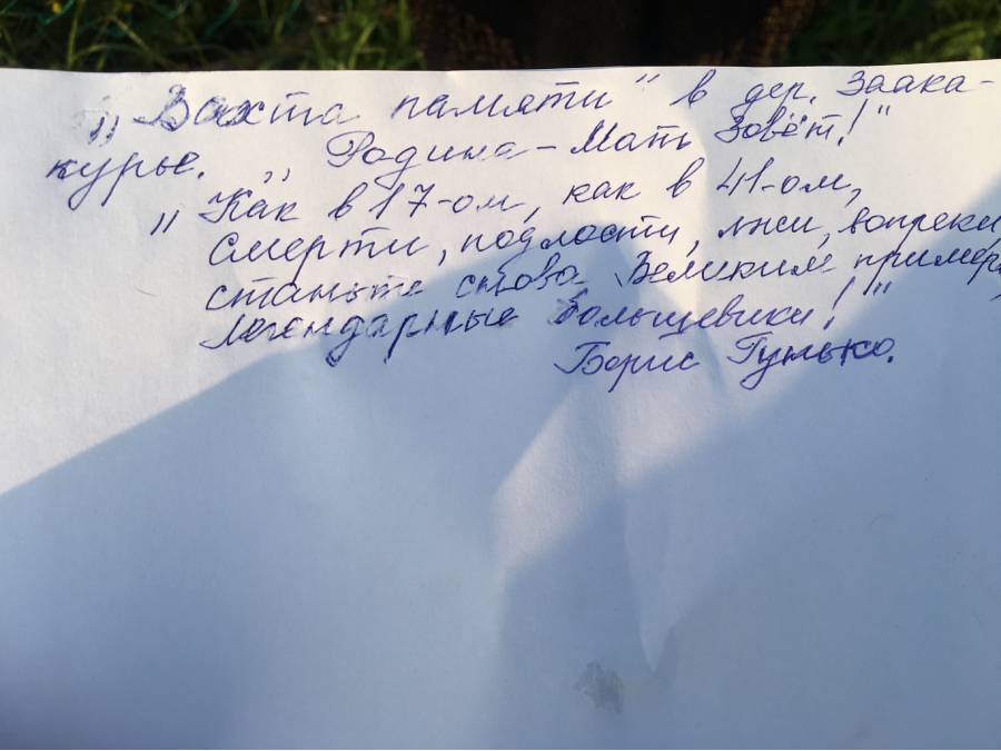 Были установлены на доме красный флаг СССР с серпом и Молотом и транспаранты на заборе. Звучали песни Победы из динамиков радиоусиления. Распространялись газеты «Серп и Молот БОЛЬШЕВИКА», проводились беседы о Победе советского народа над фашистской Германией. Жители деревни тепло встретили эту политическую акцию…