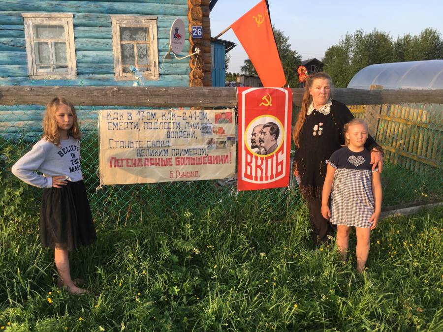 В деревне Заакакурье Мезенского района Архангельской области 9 мая 2021 г. Петропавловская Ольга Германовна - кандидат в члены ЦК ВКПБ, провела политическую акцию у своего дома в честь 76-й годовщины Победы советского народа над фашистской Германией в Великой Отечественной войне 1941-1945 г.