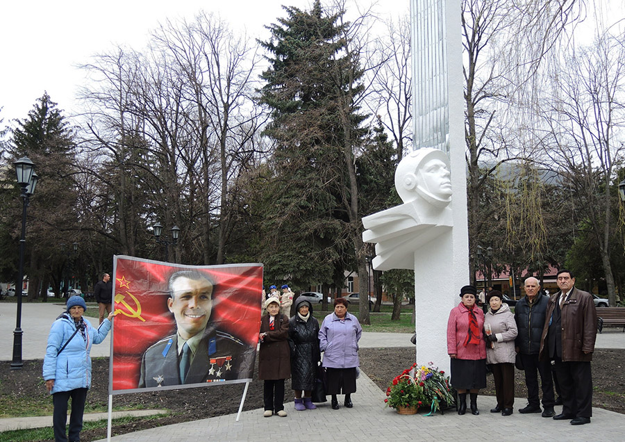Был выставлен баннер с портретом Ю.А. Гагарина на фоне красного знамени с серпом и молотом, у которого с удовольствием фотографировались участники возложения цветов, жители города и школьники...